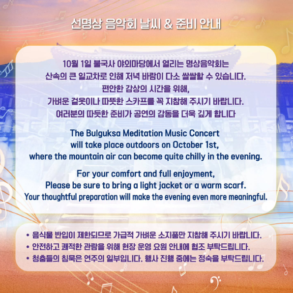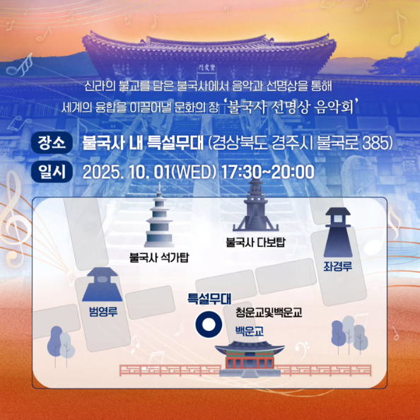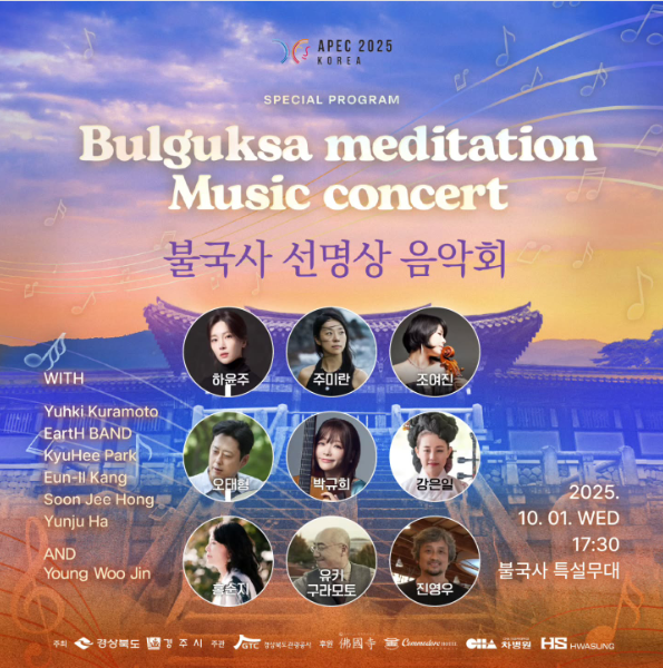 APEC 2025 불국사 선명상음악회 페이지 정보 작성자 최고관리자 댓글 0건 조회 1,195회 작성일 25-09-24 11:30 본문 불국사 특설무대 선착순 좌석 100석 모집 진행 중 (좌석은 추첨에 의하여 배정되며, 티켓 배부처에서 티켓을 수령하신 후 입장하셔야 합니다)https://form.naver.com/response/DC9qvCnIp231Plbl5DbU6w 목록 이전글제53회 신라문화 영산대재 안내 25.10.08 다음글APEC 2025 솥의 기억 특별전 -불국사박물관 25.09.24